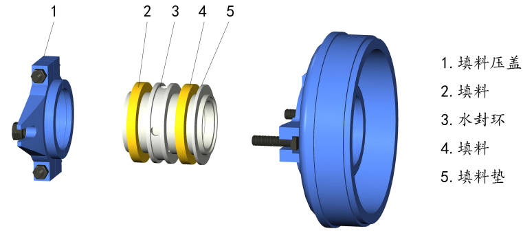 4. 最后将填料压盖安装,螺栓不要拧太紧,开泵后根据填料处滴水量,再调整填料压盖的松紧度。